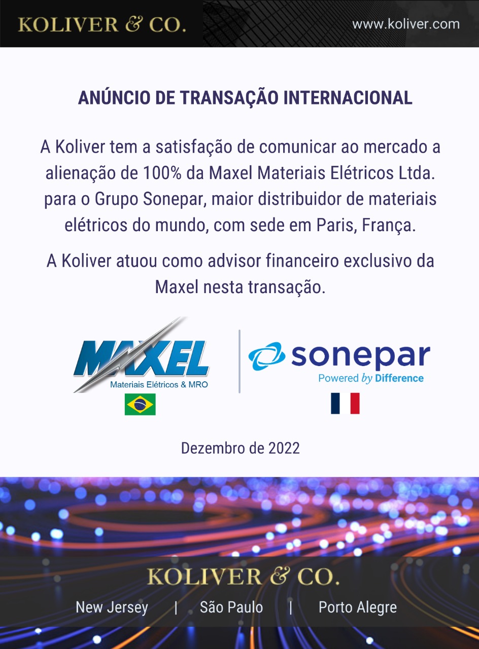 A Koliver & Co. estruturou esta operação internacional e atuou como assessor financeiro exclusivo da Maxel na alienação para o Grupo Sonepar, da França, maior distribuidor de materiais elétricos do mundo